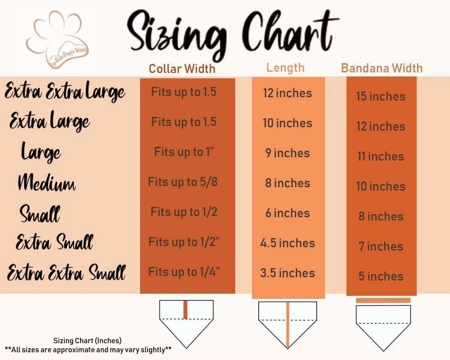 Tie-On: traditional style tied around your dog’s neck. Available in 3 sizes (Small, Medium, Large).